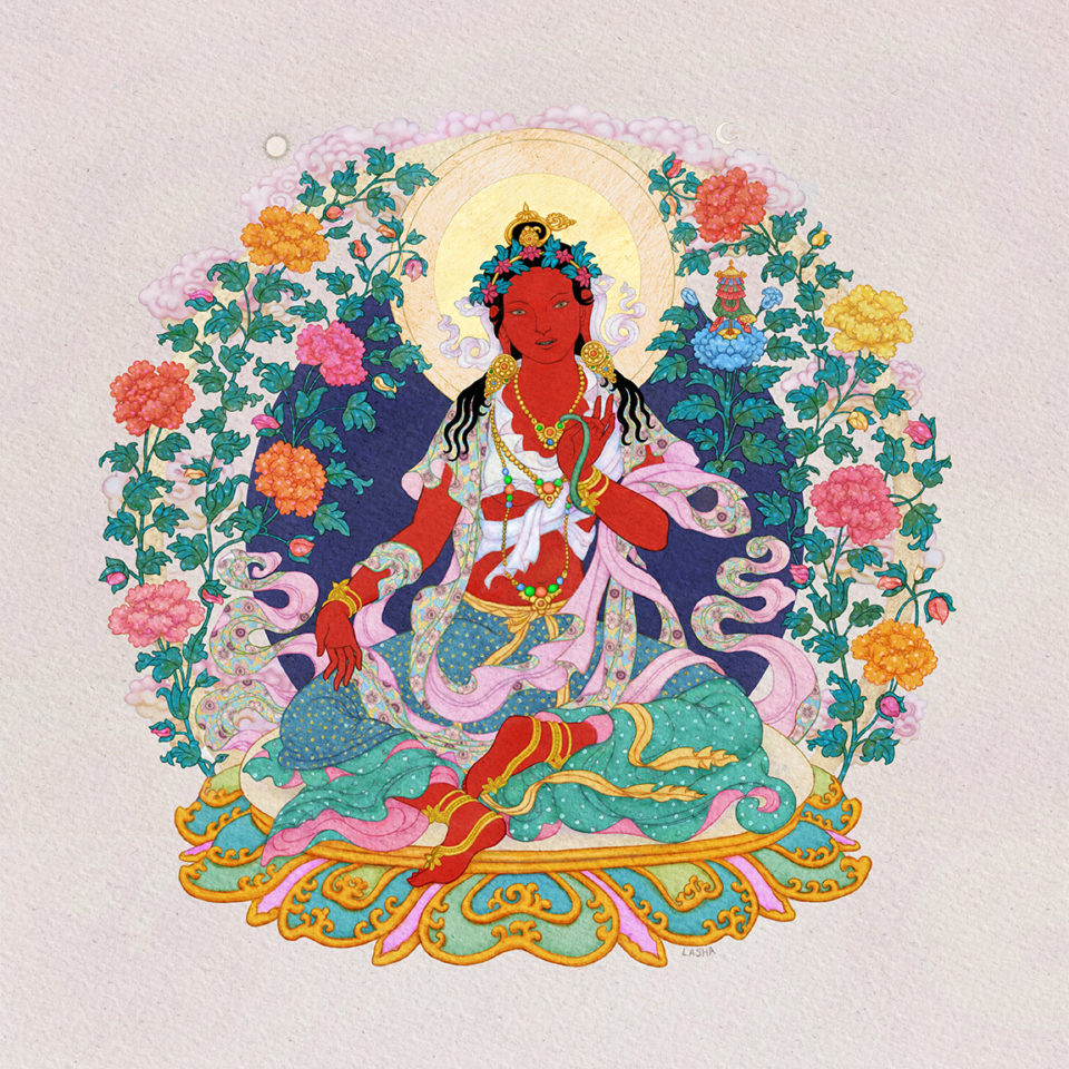 Jigten Sumlé Gyalma – She Who is Victorious Over the Three Worlds. The tenth of Atisha’s 21 Taras is peaceful and red in colour. This manifestation of Tara is adorned by a crown that emanates a brilliant garland of light, spreading joy to sentient beings. Her peals of laughter ring out, providing protection from worldly distractions that prevent practice, and a victory banner rests on the lotus blooming beside her left ear. Original digital painting – 2020