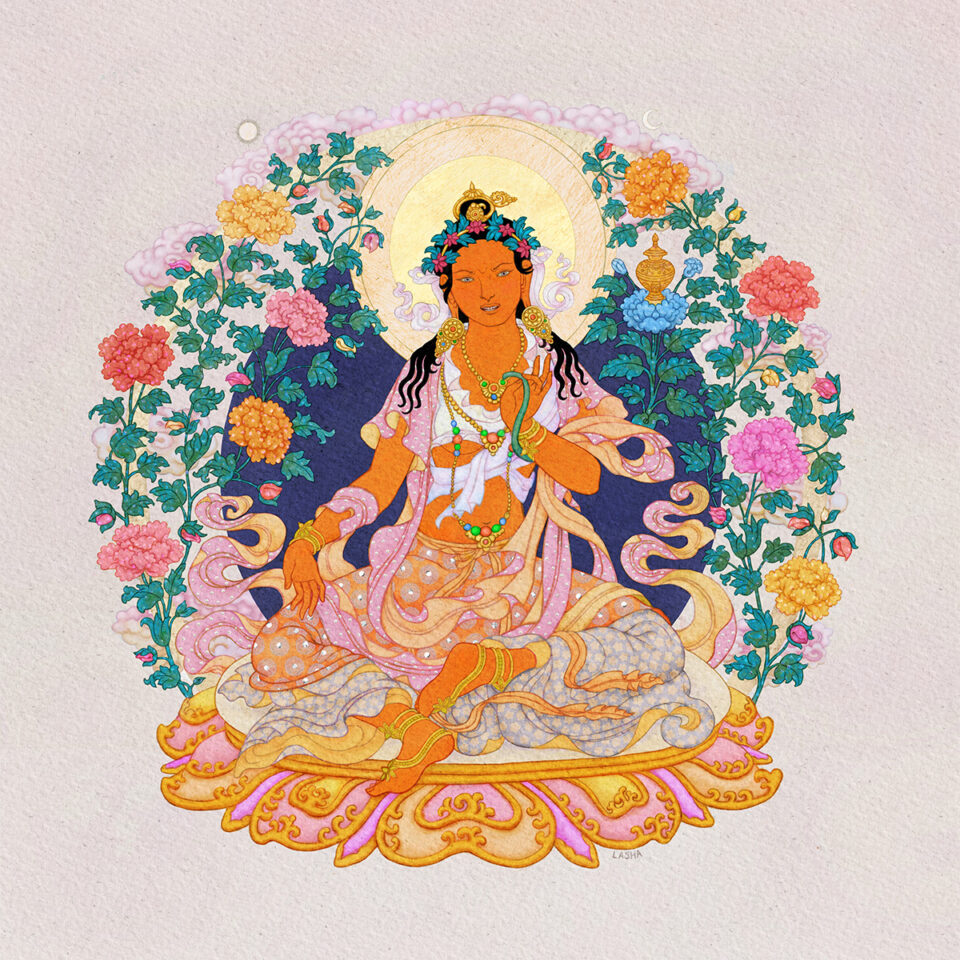 Phagma Norter Drölma – Supreme Bestower of Riches. The eleventh of Atisha’s 21 Taras is orange/red and has a frowning, wrathful expression on her face. She alleviates the suffering of all types of poverty by providing not only material wealth, but intangible gifts such as joy, peace, compassion and enlightenment. A treasure vase filled with jewels rests on the lotus to her left. Original digital painting – 2020
