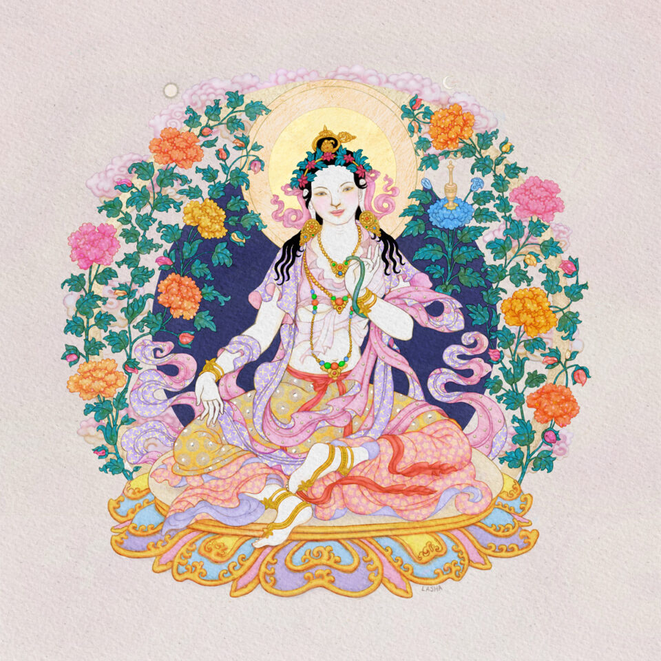 Rabzhima – Calm Pacifier of Negative Actions and Obscurations. The 15th of Atisha’s 21 Taras is peaceful and as radiant as a full moon in autumn. She cultivates bliss and happiness by purifying erroneous conduct and eliminating obscurations. An anointing vase holding a purifying nectar rests upon her utpala flower. Original digital painting – 2021