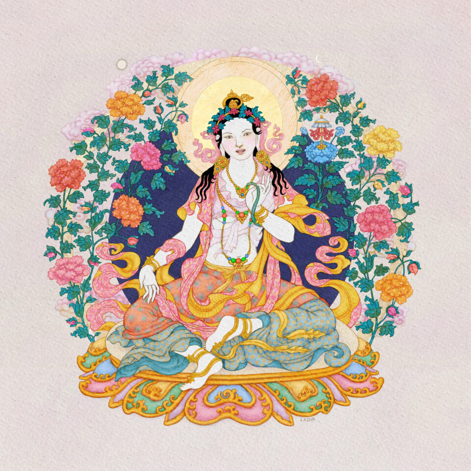 Tara Dugkarmo – Queen of the White Umbrella. The 19th of Atisha’s 21 Taras displays a semi-wrathful smile and is white in colour. This manifestation of Tara offers protection from nightmares and bad omens, perpetuating serenity and peace in their place. She also plays the important role of safeguarding the Dharma and those that teach it from discord and conflict. A white umbrella appears on Tara’s utpala flower. Original digital painting, 2022.