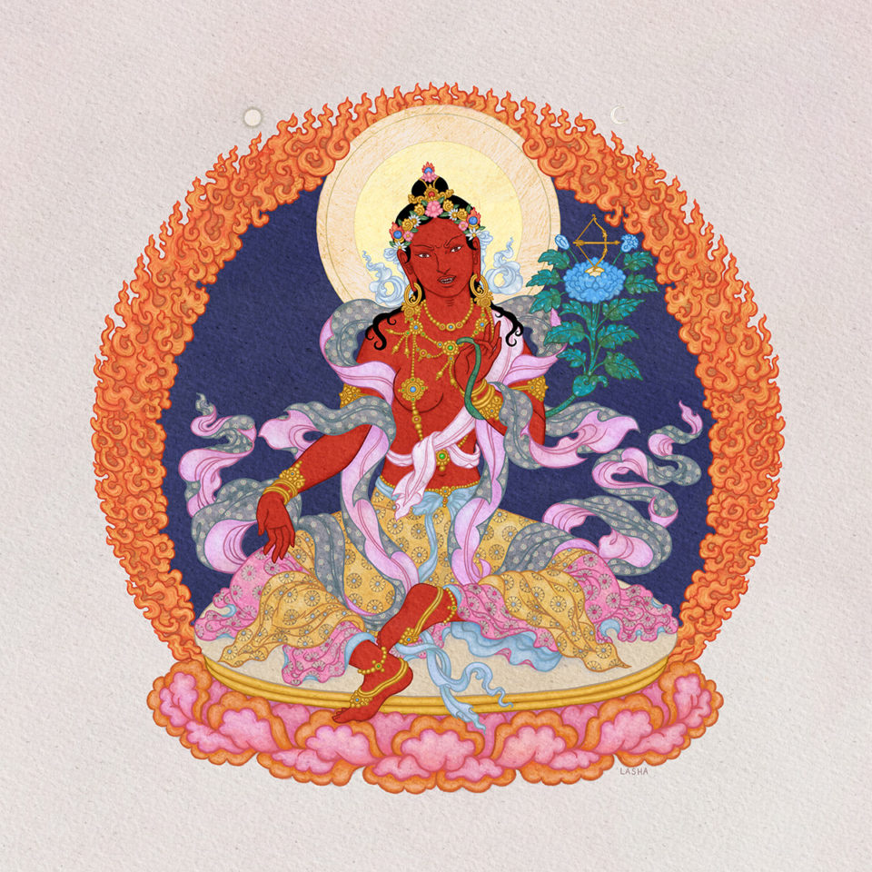 Wangdü Rigjé Lhamo (Kurukulle) – Magnetizing Goddess of Profound Wisdom. The fifth of Atisha’s 21 Taras is semi-wrathful and red in colour. She is known for magnetizing all that is beneficial, but also accomplishes the remaining three actions of pacifying, enriching, and subduing. A bow and arrow is found upon her utpala flower.